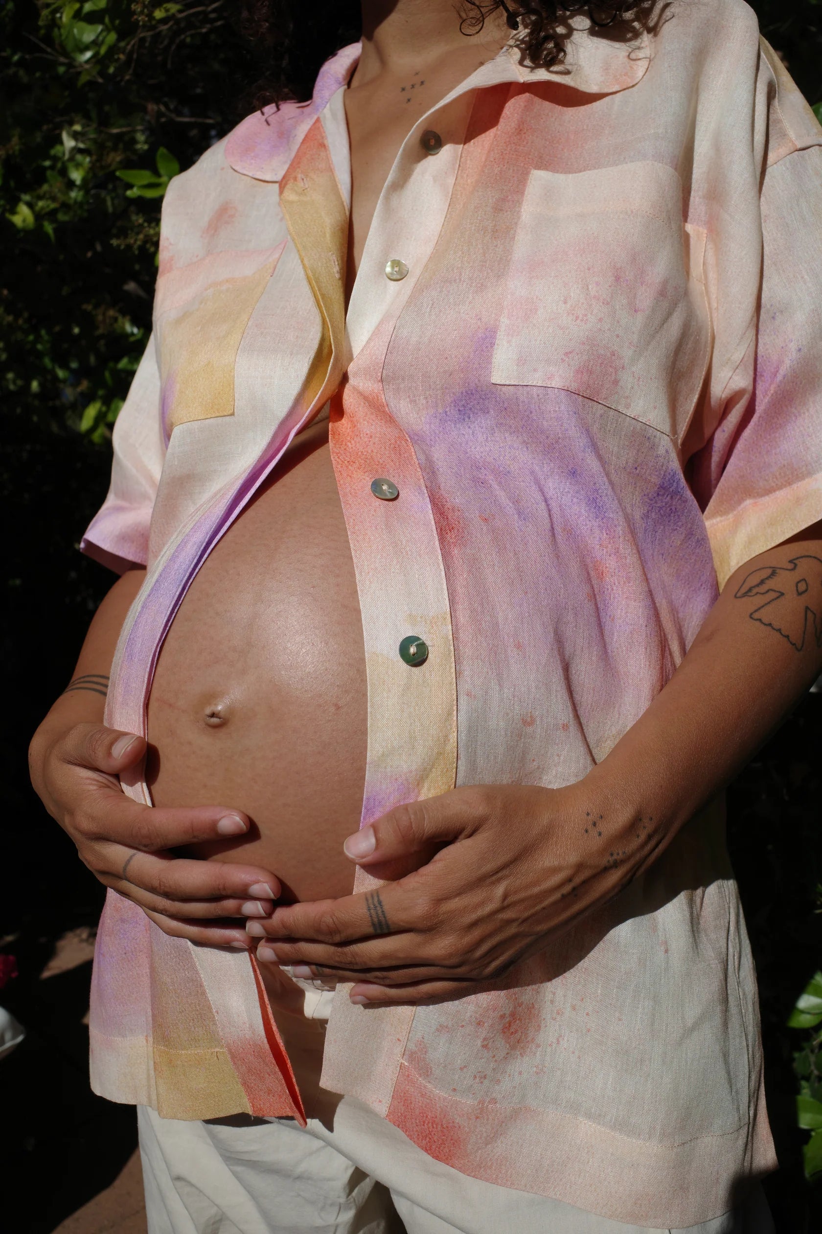 This oversized, relaxed style is cut in breathable pure linen. The soft rounded collar adds a touch of femininity to the throw-on style. Featuring a drop shoulder and petite shell buttons, the shirt is a comfortable and classic staple ideal for everyday wear and nursing. The unique custom artwork has been placed large scale onto the shirt, therefore each piece is one of its kind and all irregularities are characteristic of the technique used in the making of this piece.