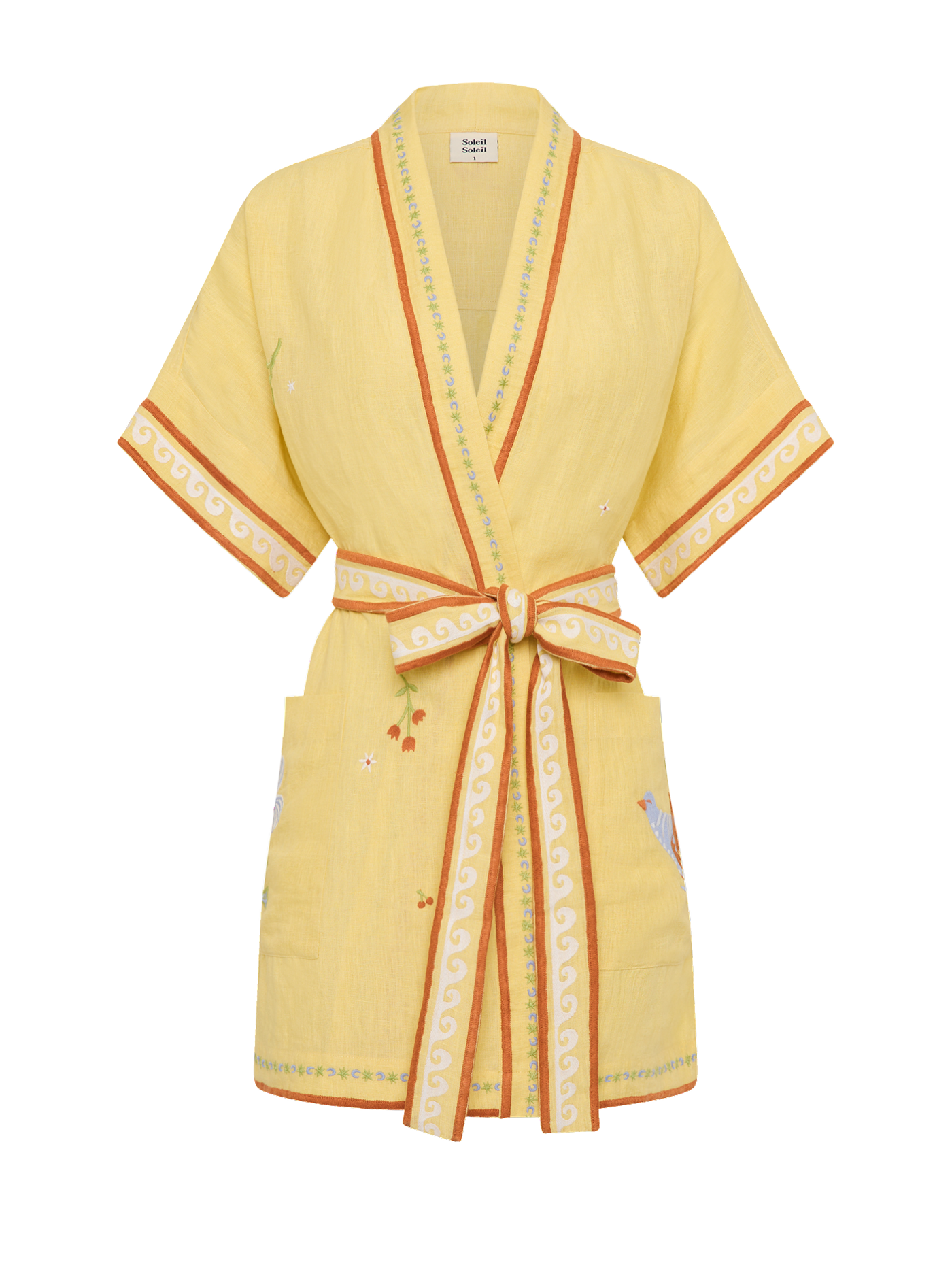 The 'Lennon' Mini Dress is our answer to summer dressing dilemmas. An evolution of the best-selling Brea silhouette, it retains the same boxy fit and oversized short sleeves while introducing a continuous banded neckline for a slightly more structured feel. Designed to wrap cleanly around the body and tie closed as a dress or worn open over swimwear.