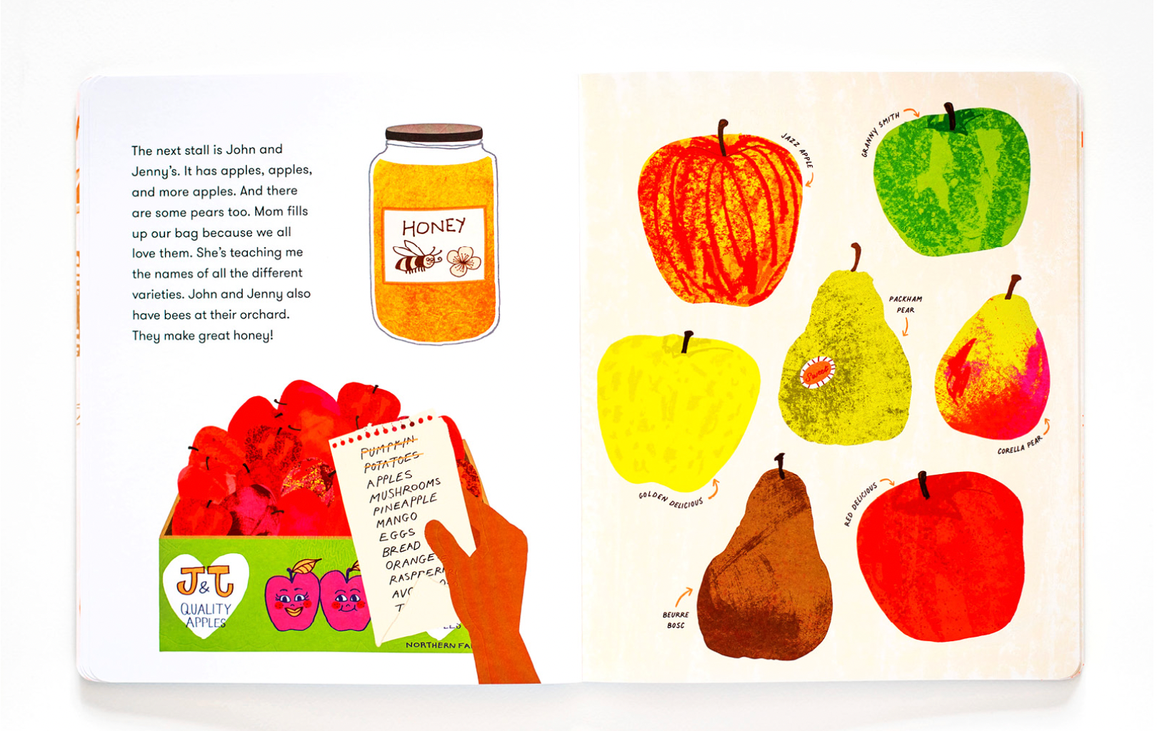 ‘Off to the Market’ is a journey through the weekly shop with mum; following a list and making plans for what to cook for the week. The book brings together everything I love about a market visit- shopping seasonal, chatting to stall holders, taking in the colours, having a snack and admiring the graphic signs and boxes. All these things are illustrated in the book, with plenty of fruit & veg info to be gleaned along the way.