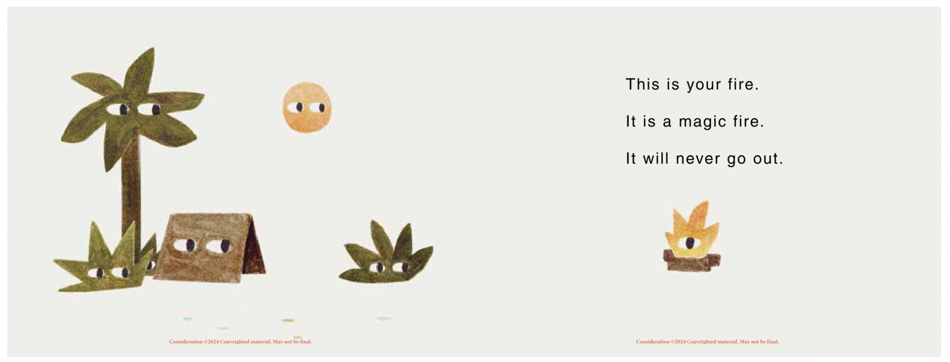 With a minimal tableau of familiar objects and a gentle rhythm suited for reading aloud, an island and all its items – a tent, a fire, a boat, a bird – are assembled, ending with bedtime as the sun goes down. This is an island for a young child to have whenever they want to go there. One in a trio of board books focussing on safe spaces, comfort and imagination, Your Island signals both a departure for Jon Klassen and a story whose peculiar touches of whimsy stamp the book as iconically his.